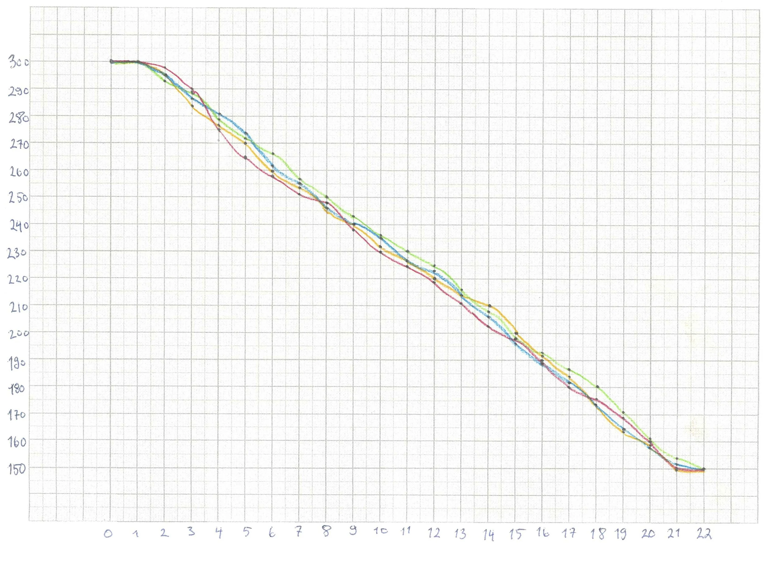 Phill Niblockin Descent sisältää rinnakkain mutta itsenäisesti oktaavin alalla liukuvia ääniä. Partituuri koostuu taulukosta säveltaajuuksia, jotka määrittävät neljä yhdestä alkupisteestä samaan loppupisteeseen laskevaa murtoviivaa. Viivat on “kaiverrettu” elektronisesti Moog-syntetisaattorin oskillaattoria manipuloimalla, viritysmittarin neulan kärjen liikettä tarkasti seuraten. Nämä tallenteet ovat toimineet lähtökohtina selloäänityksille, joissa soittaja pyrkii jäljentämään alkuperäiset kuvaajat minimoimalla huojunnan kahden äänilähteen välillä. Esityksessä tähän kuvaan lisätään viides viiva, äänitysten keskiarvo.